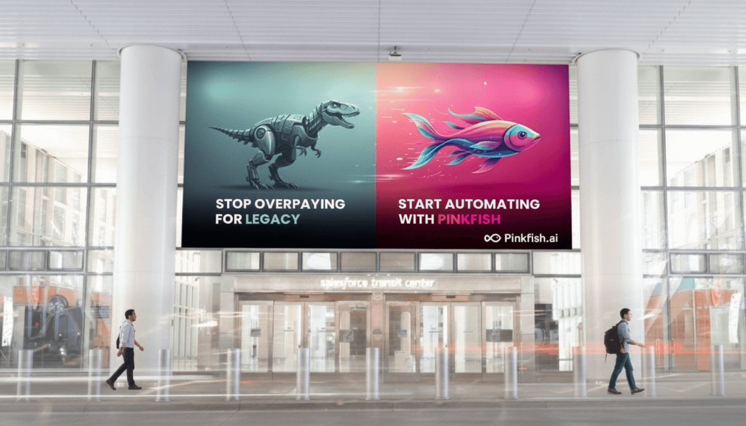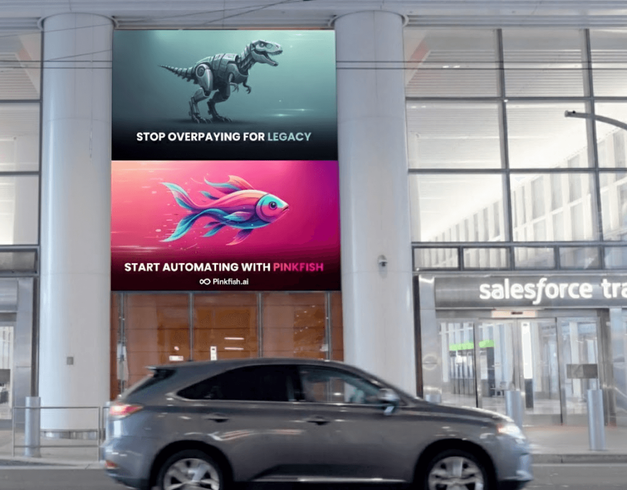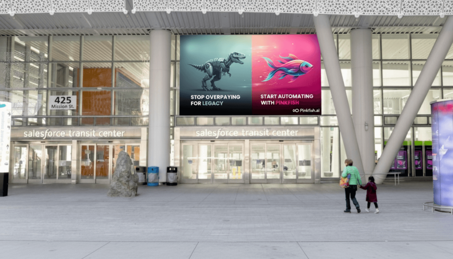 If you are anywhere near the Salesforce Transit Center during Dreamforce, you couldn’t miss it. A massive billboard showing an antiquated mechanical dinosaur on one side and a bold, vibrant pink fish on the other, swimming confidently toward the future.